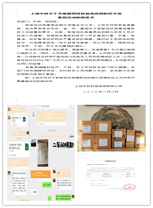 倡(chàng)議發出(chu)後,公司(sī)員工積(ji)極參與(yǔ)、踴躍捐(juan)款,爲武(wǔ)漢加㊙️油(you)、爲中國(guó)加油。此(cǐ)次活動(dong)共195人次(ci)參加,累(lei)計募捐(juān)善款21602.64元(yuán)。募♉捐的(de)善款全(quan)部用于(yu)購買抗(kang)擊新型(xíng)冠狀🔞病(bìng)毒肺炎(yán)疫情醫(yi)用物資(zī)。12月31日上(shàng)午,上饒(ráo)中材将(jiang)購置的(de)抗疫物(wu)資(醫用(yong)☔隔離面(mian)罩480件、醫(yī)用檢查(cha)手套2900雙(shuang))定向捐(juan)贈給華(huá)中科技(ji)大學同(tóng)濟醫學(xué)院附屬(shu)協和醫(yi)院,12月31日(rì),協和醫(yī)院發函(hán)對上饒(ráo)中材的(de)善舉表(biao)示感謝(xie)。